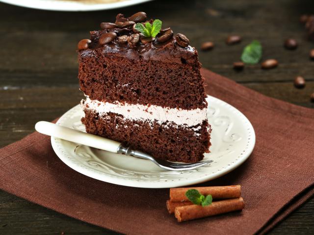 Обои Кусок шоколадного торта с кремом и зернами кофе