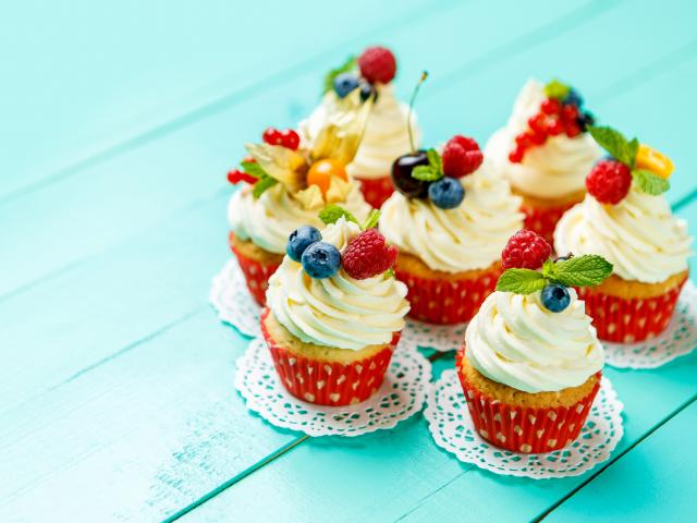 Обои Кексы со взбитыми сливками украшены ягодами