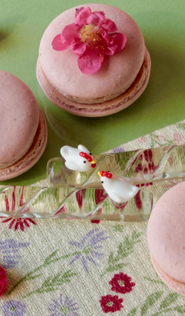 Обои Розовый десерт макарон на столе с белыми цветами ромашек