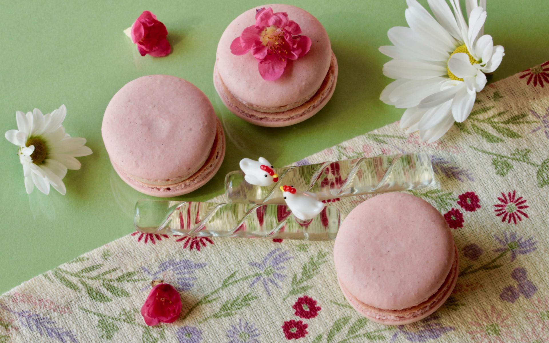 Обои Розовый десерт макарон на столе с белыми цветами ромашек