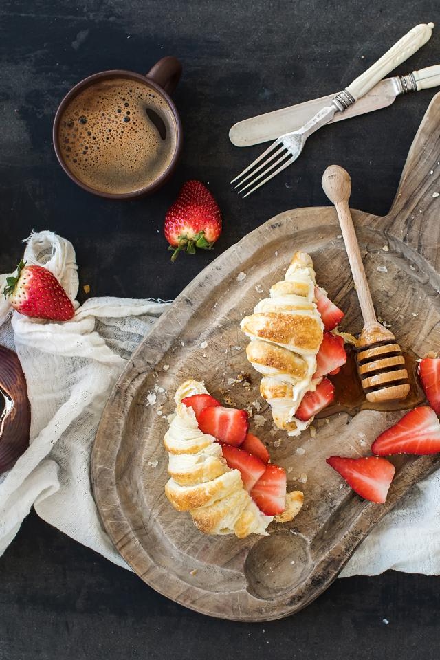 Обои Круассаны на доске с клубникой и медом