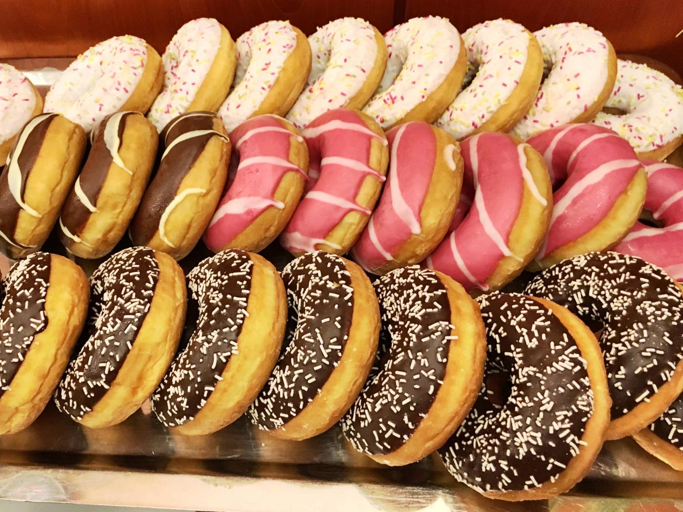 Обои Много вкусных сладких пончиков с глазурью на столе