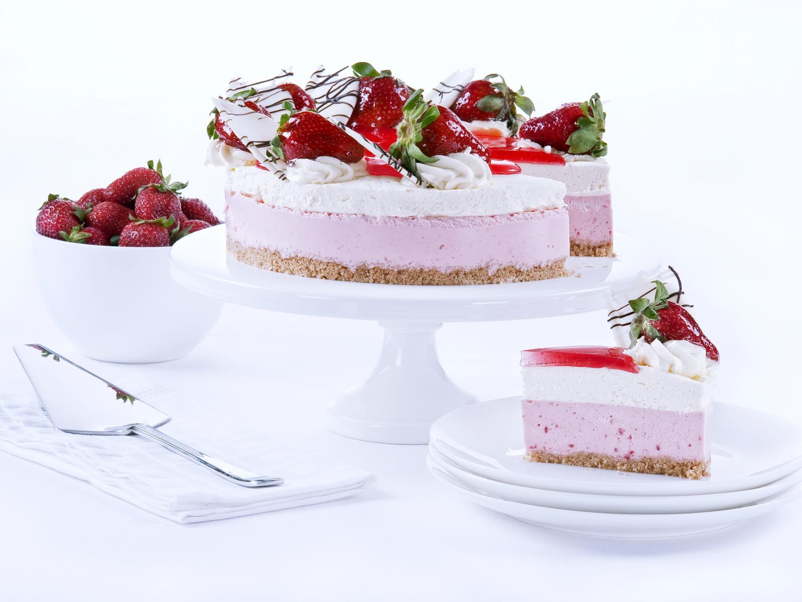 Обои Аппетитный праздничный торт с клубникой на столе
