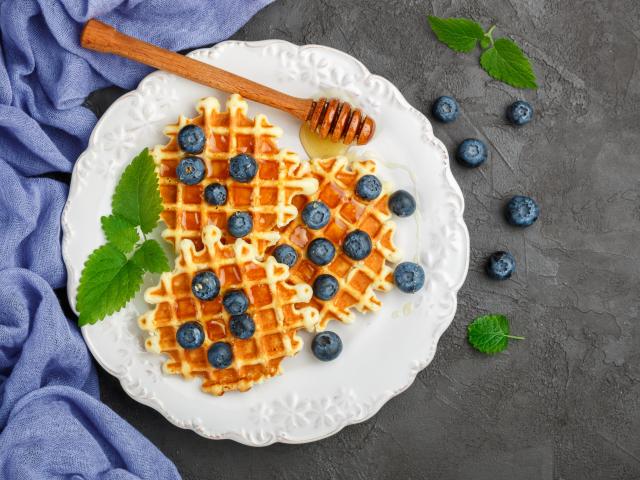 Обои Сладкие вафли с медом на тарелке с ягодами черники