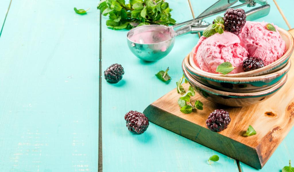 Обои Шарики мороженого на столе с ягодами черники и мятой