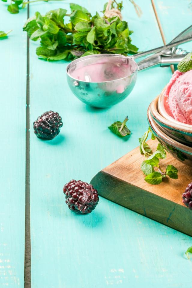 Обои Шарики мороженого на столе с ягодами черники и мятой