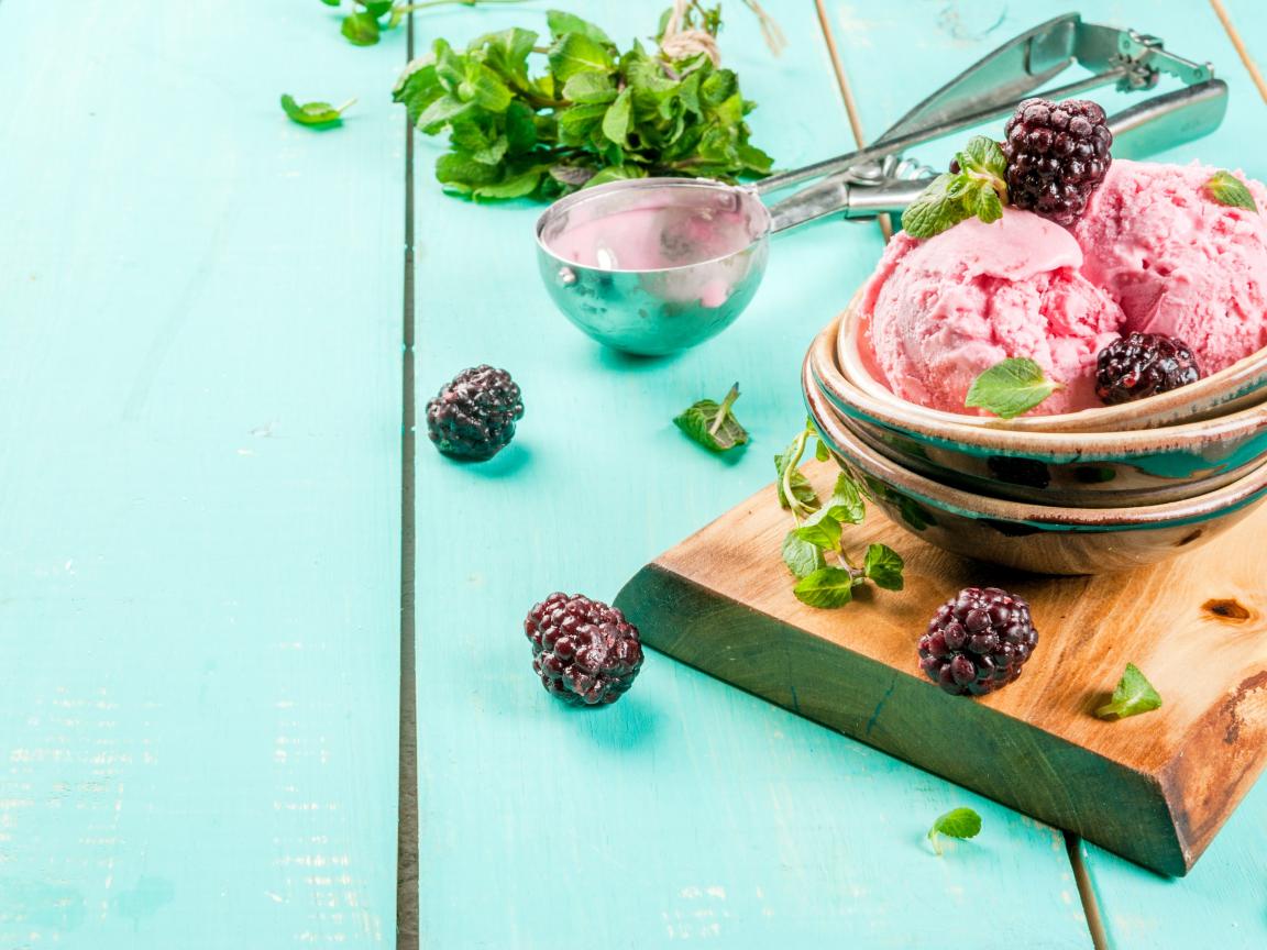 Обои Шарики мороженого на столе с ягодами черники и мятой