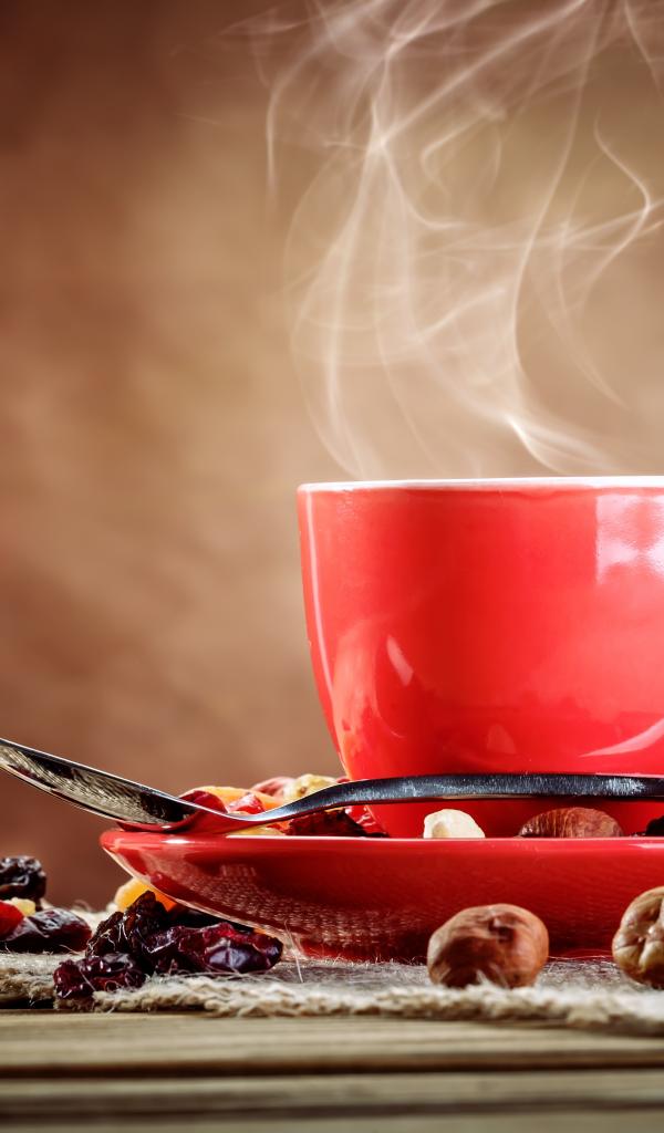 Обои Чашка горячего кофе на столе с сухофруктами
