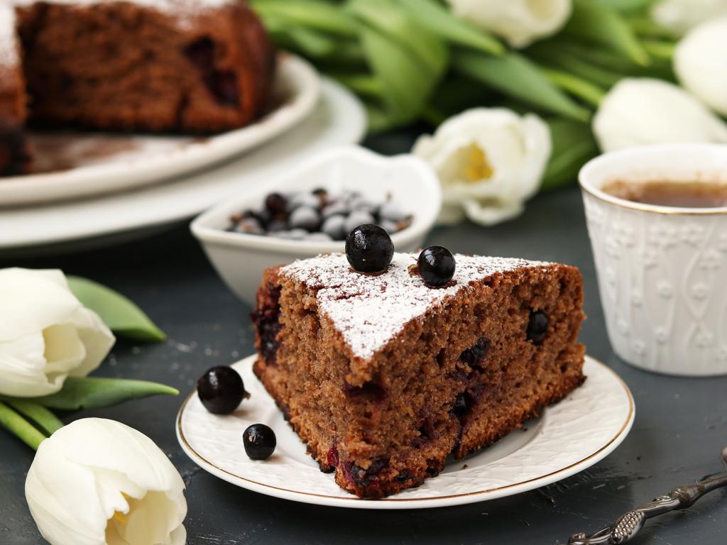 Обои Кусок пирога со смородиной на столе с тюльпанами