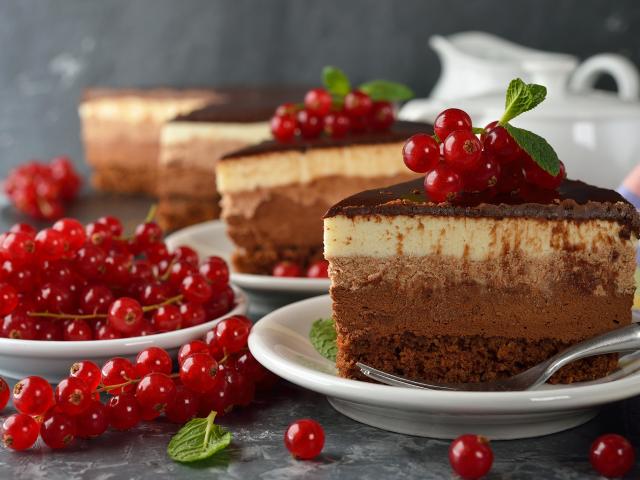 Обои Кусок торта Три шоколада с ягодами красной смородины
