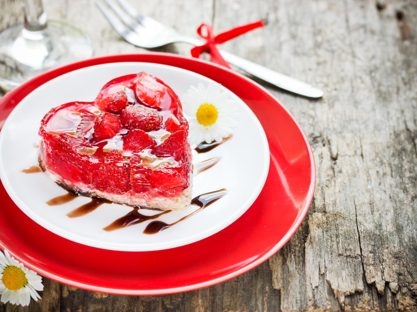 Обои Пирожное с клубникой в форме сердца на тарелке с ромашками