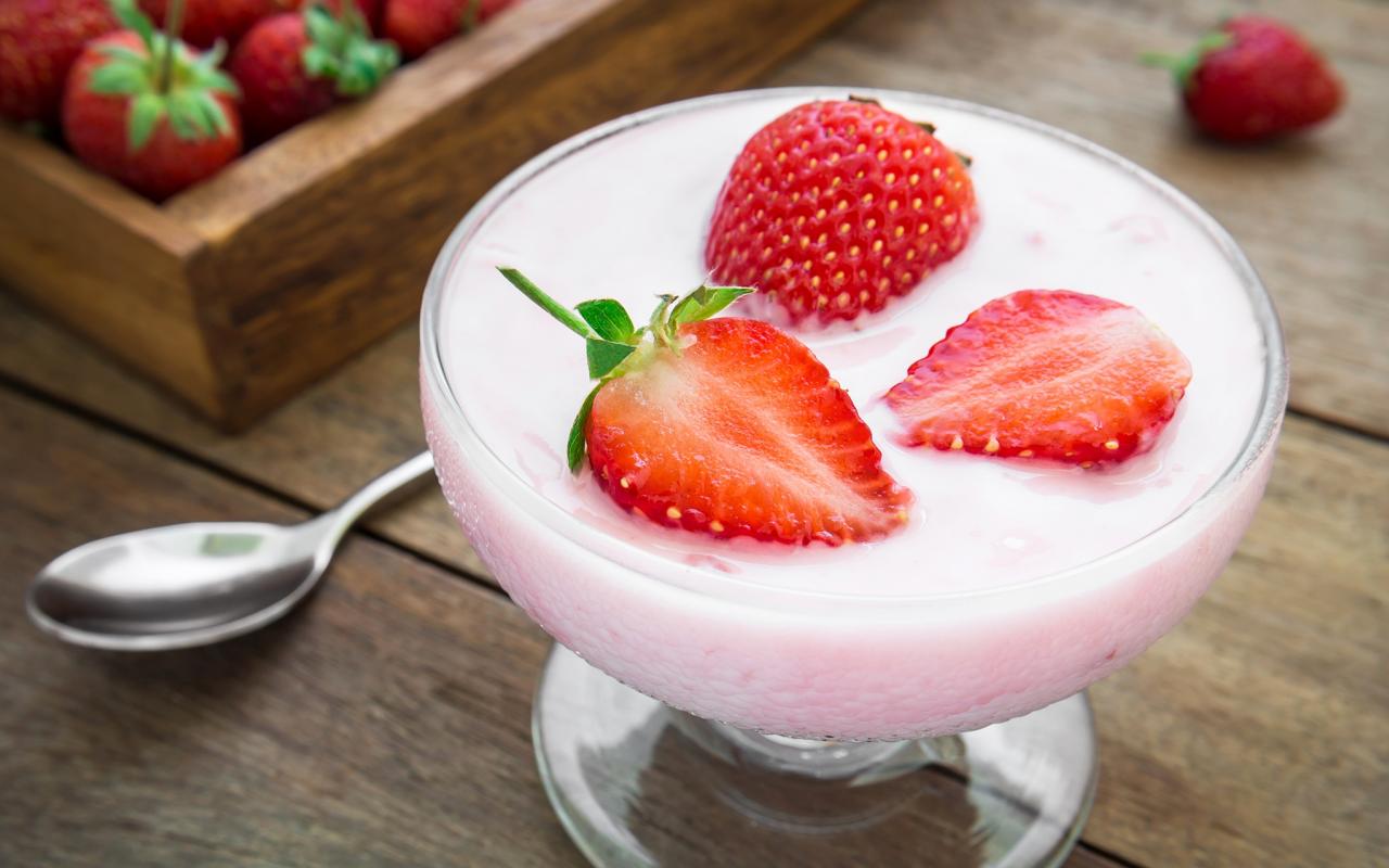 Обои Молочный десерт в креманке с ягодами клубники