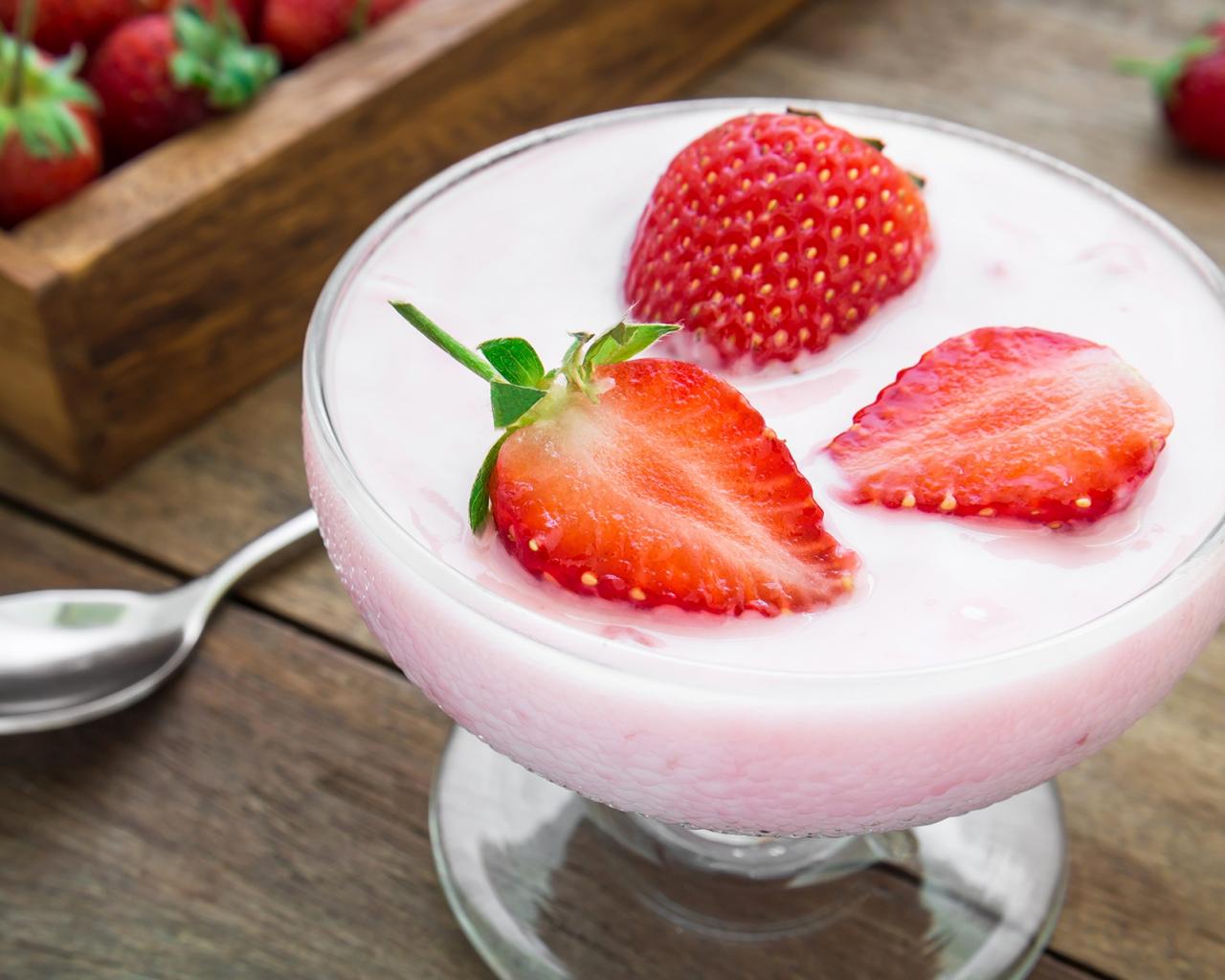 Обои Молочный десерт в креманке с ягодами клубники
