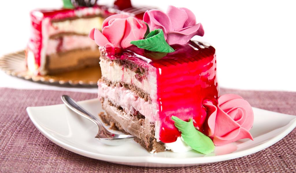 Обои Кусок аппетитного торта декорирован розами из крема