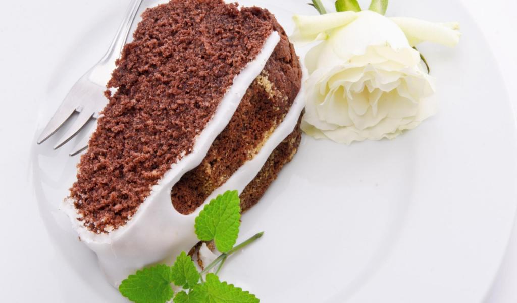 Обои Кусок шоколадного пирога на тарелке с белой розой