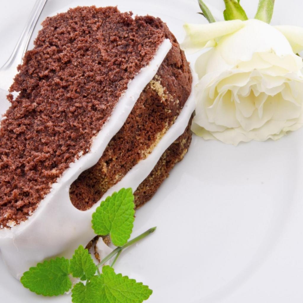 Обои Кусок шоколадного пирога на тарелке с белой розой