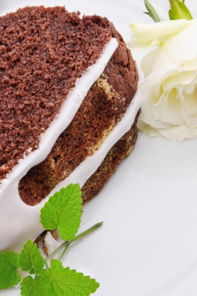 Обои Кусок шоколадного пирога на тарелке с белой розой