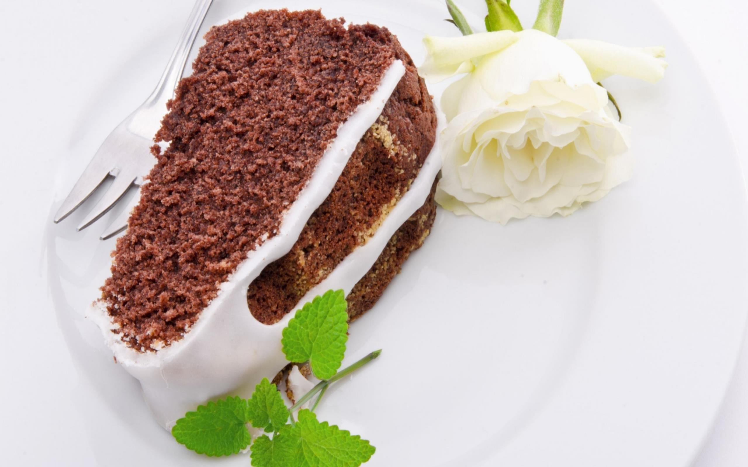 Обои Кусок шоколадного пирога на тарелке с белой розой