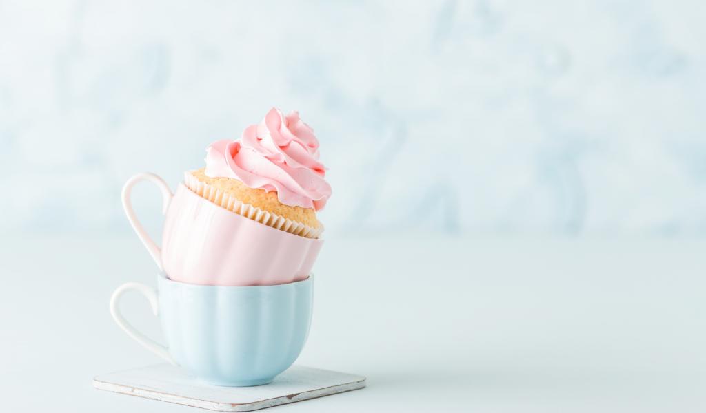 Обои Кекс с розовым кремом с чашками на столе