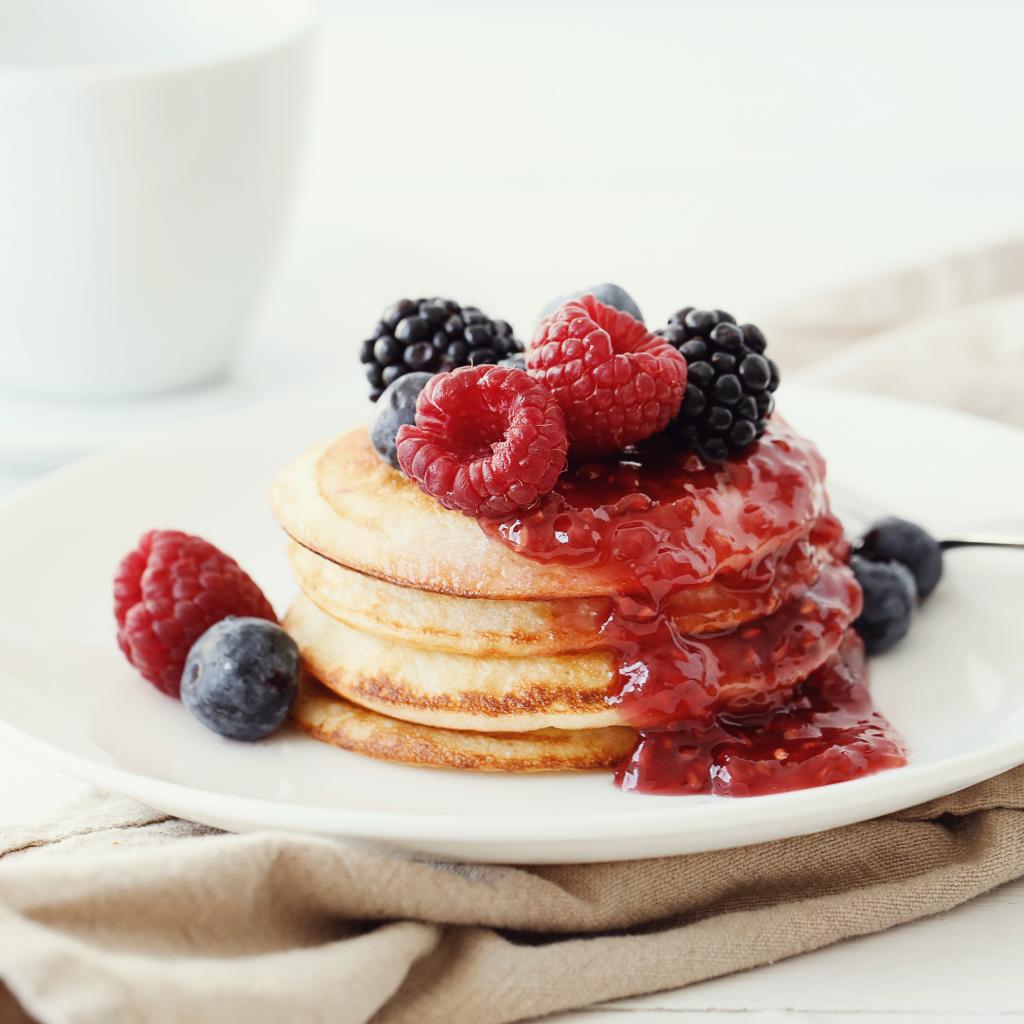 Обои Оладьи на большой белой тарелке с джемом и ягодами