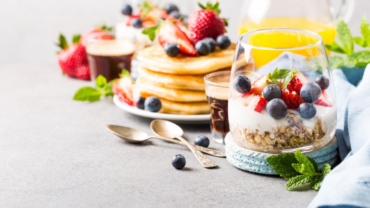 Обои Оладьи на столе с ягодами, мюсли и кофе
