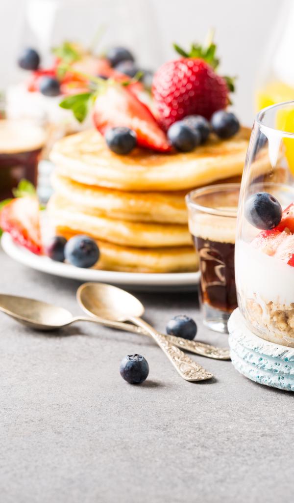 Обои Оладьи на столе с ягодами, мюсли и кофе