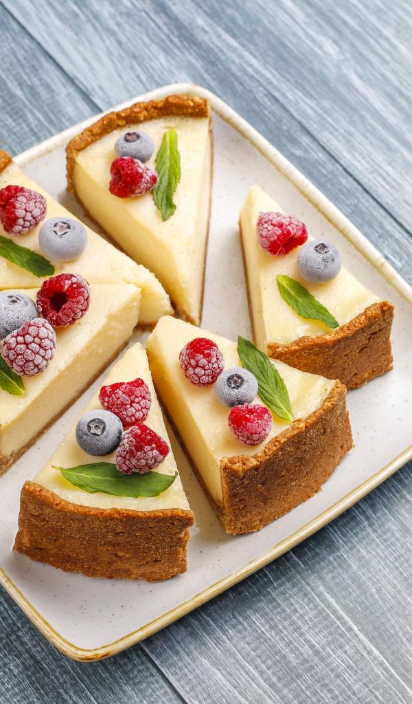 Обои Аппетитный чизкейк с ягодами нарезан кусками на тарелке
