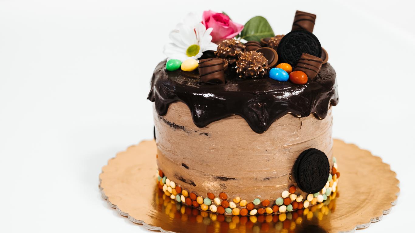 Обои Торт с кремом и шоколадом украшен сладостями