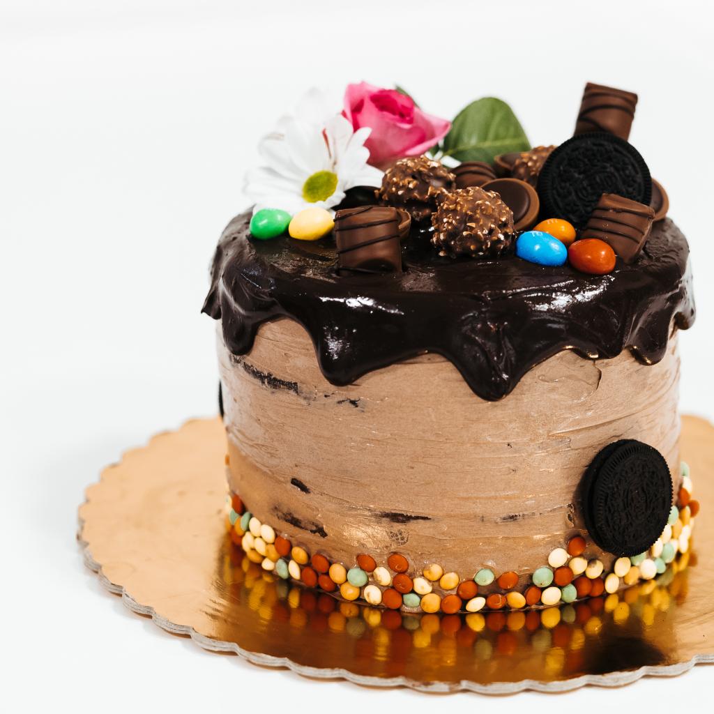 Обои Торт с кремом и шоколадом украшен сладостями