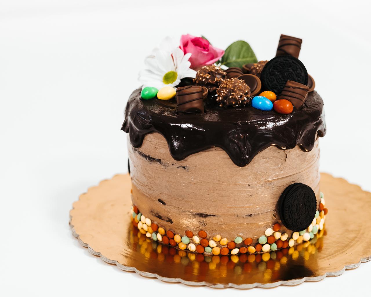 Обои Торт с кремом и шоколадом украшен сладостями