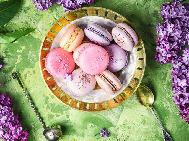 Обои Разный десерт макарон на столе с цветами сирени