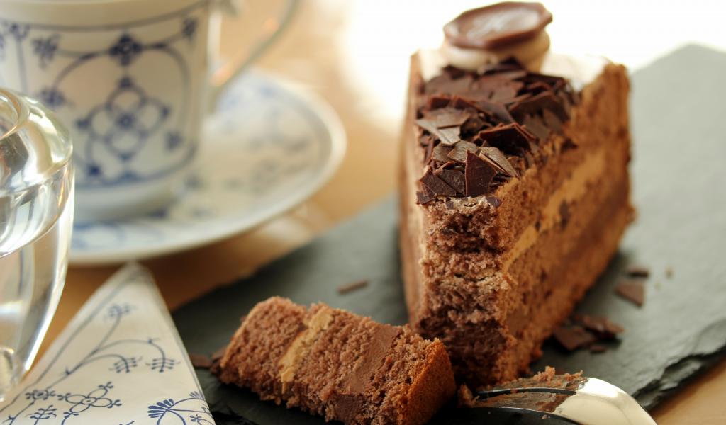 Обои Кусок торта с шоколадом на столе с кофе