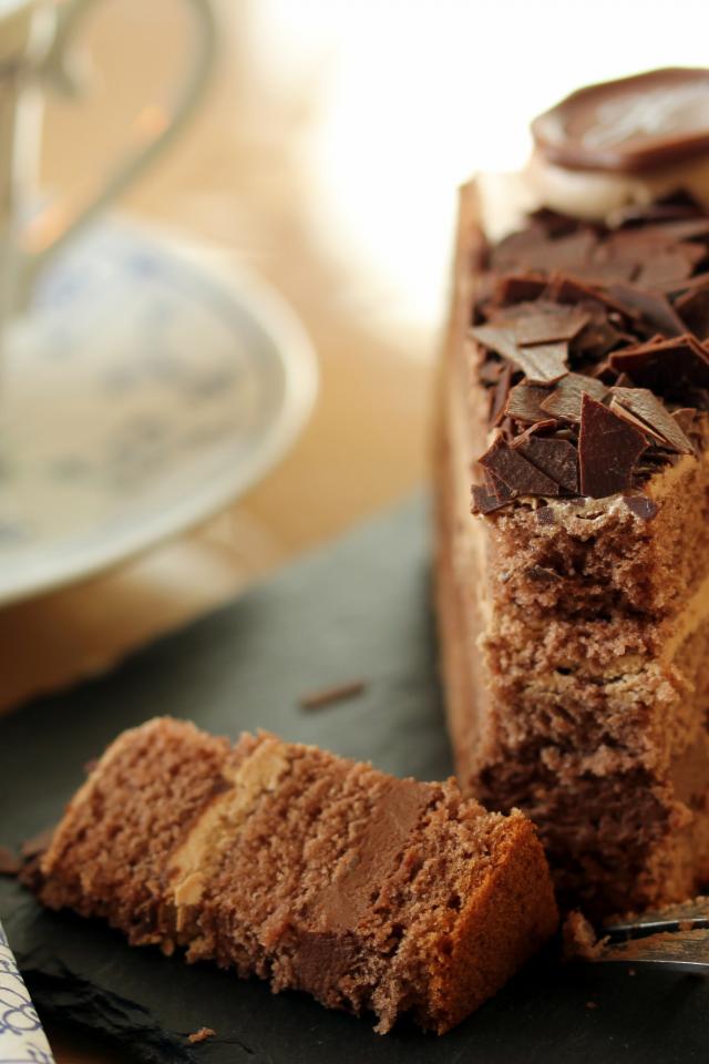 Обои Кусок торта с шоколадом на столе с кофе