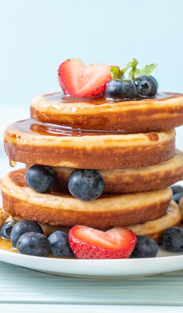 Обои Пышные оладьи с ягодами черники, клубники и медом