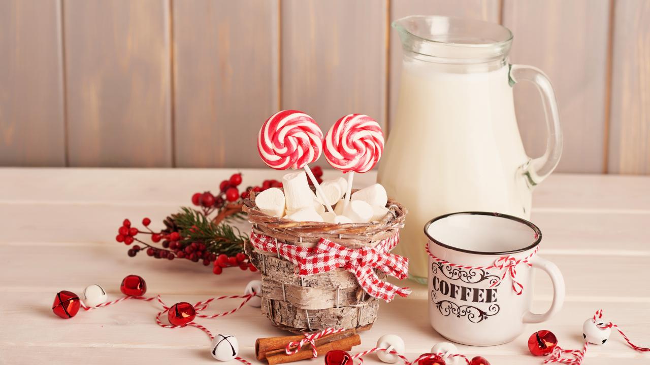 Обои Маршмеллоу на столе с кофе и молоком