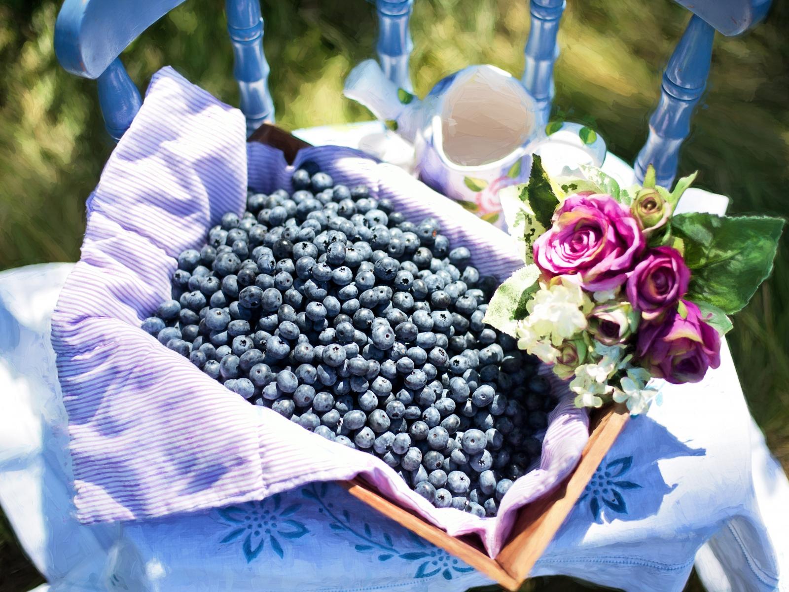Обои Корзина со спелыми ягодами черники стоит на столе