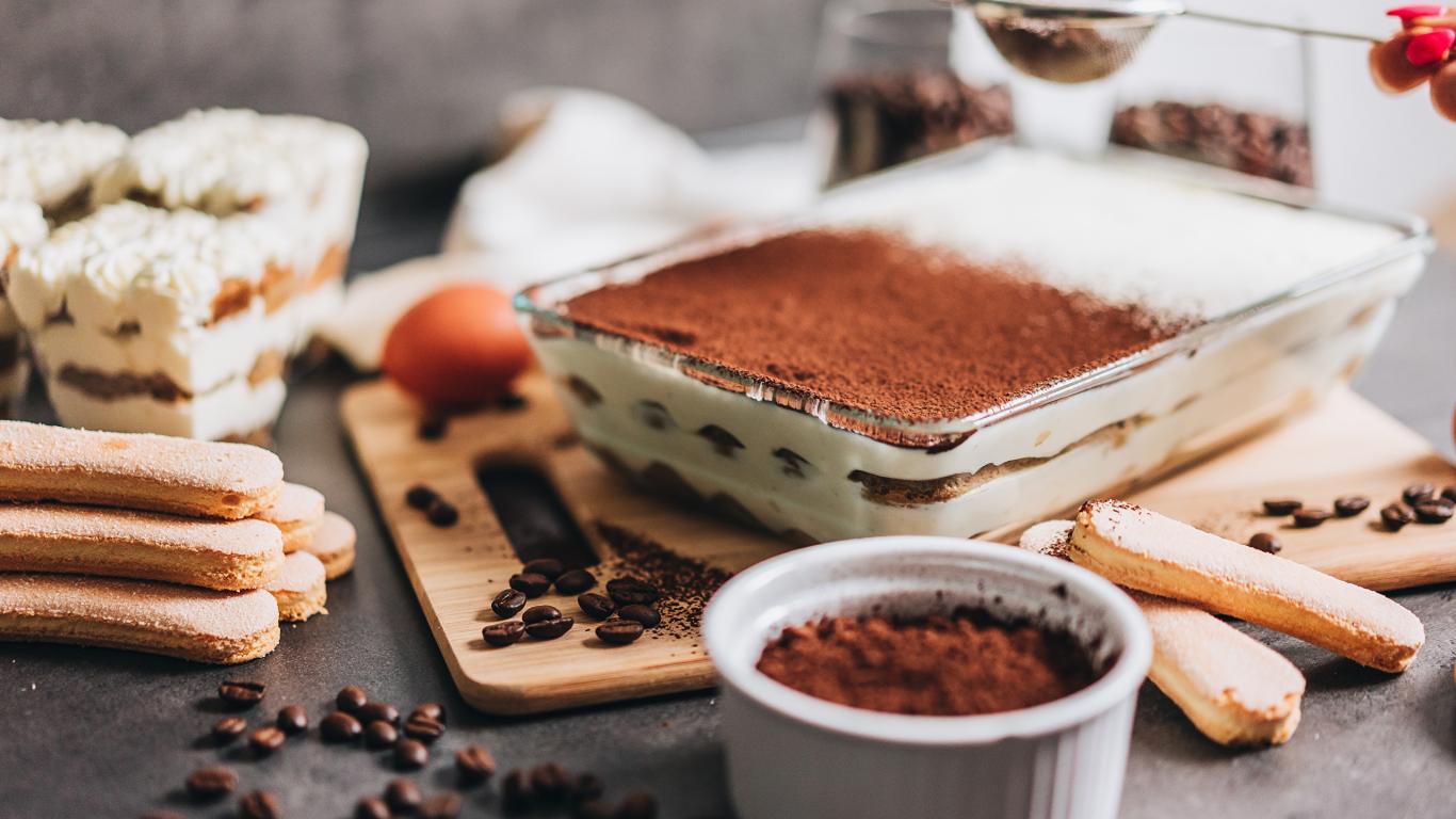 Обои Десерт тирамису на столе с какао