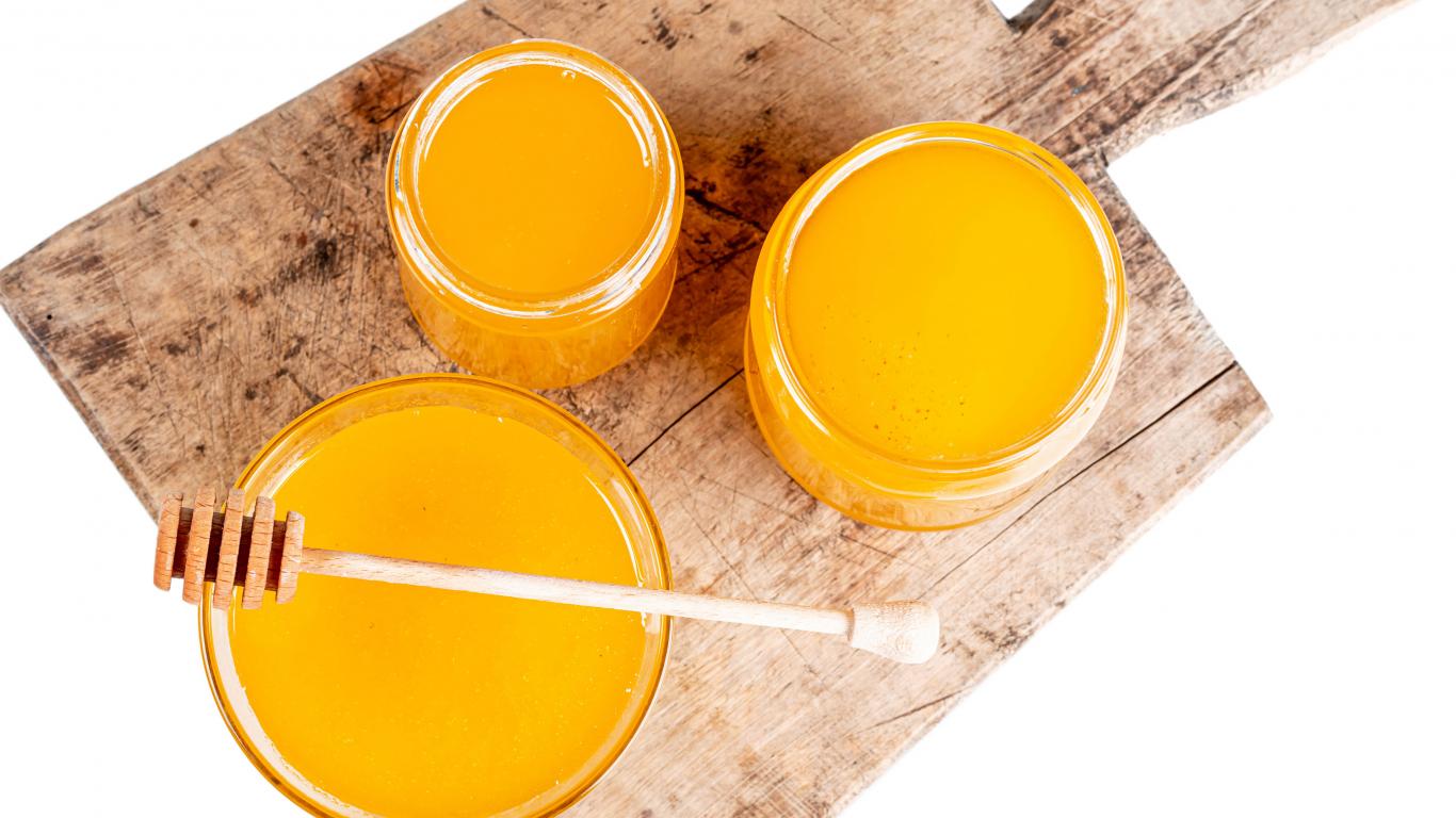 Обои Свежий мед в банках на деревянной доске на белом фоне