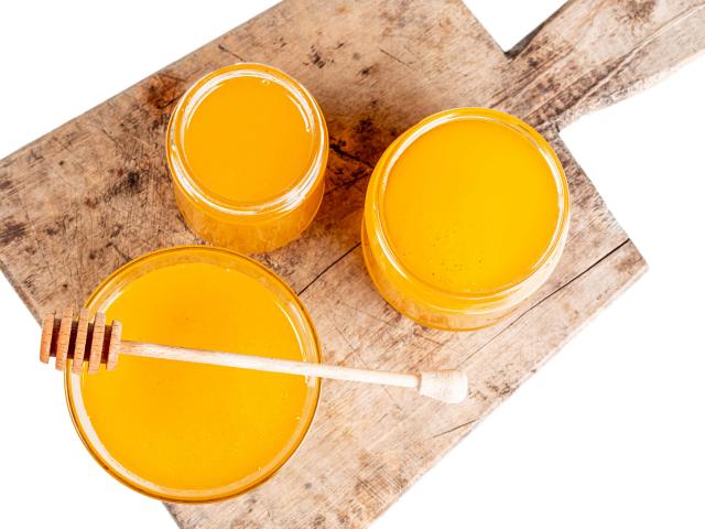 Обои Свежий мед в банках на деревянной доске на белом фоне