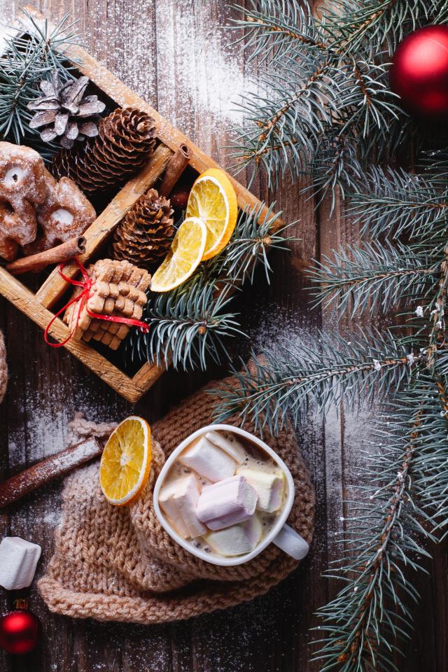 Обои Зеленая еловая ветка на столе с печеньем и шишками