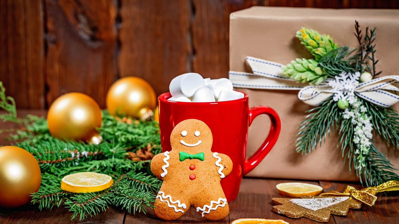 Обои Печенье, чашка, еловая ветка и подарок на Рождество