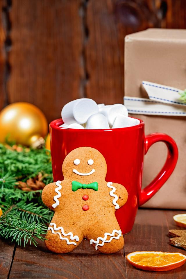 Обои Печенье, чашка, еловая ветка и подарок на Рождество
