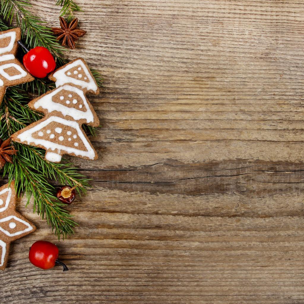 Обои Рождественское печенье с еловой веткой на деревянном фоне