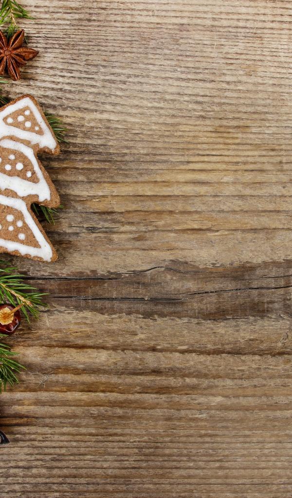 Обои Рождественское печенье с еловой веткой на деревянном фоне