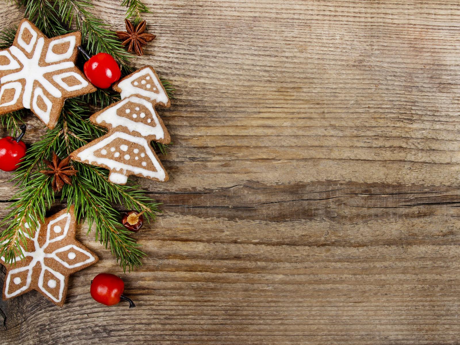 Обои Рождественское печенье с еловой веткой на деревянном фоне