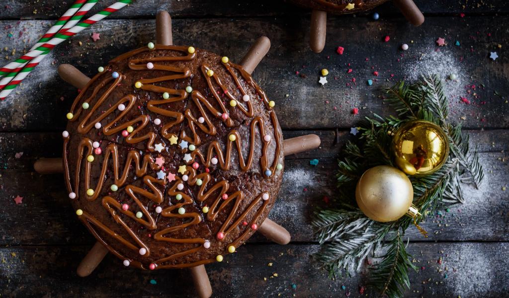 Обои Шоколадное пирожное на столе с еловыми игрушками