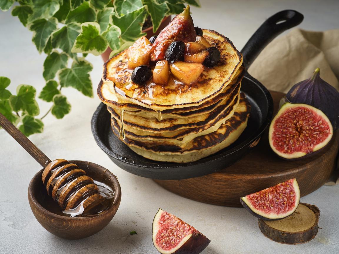 Обои Аппетитные румяные оладьи с медом и фруктами