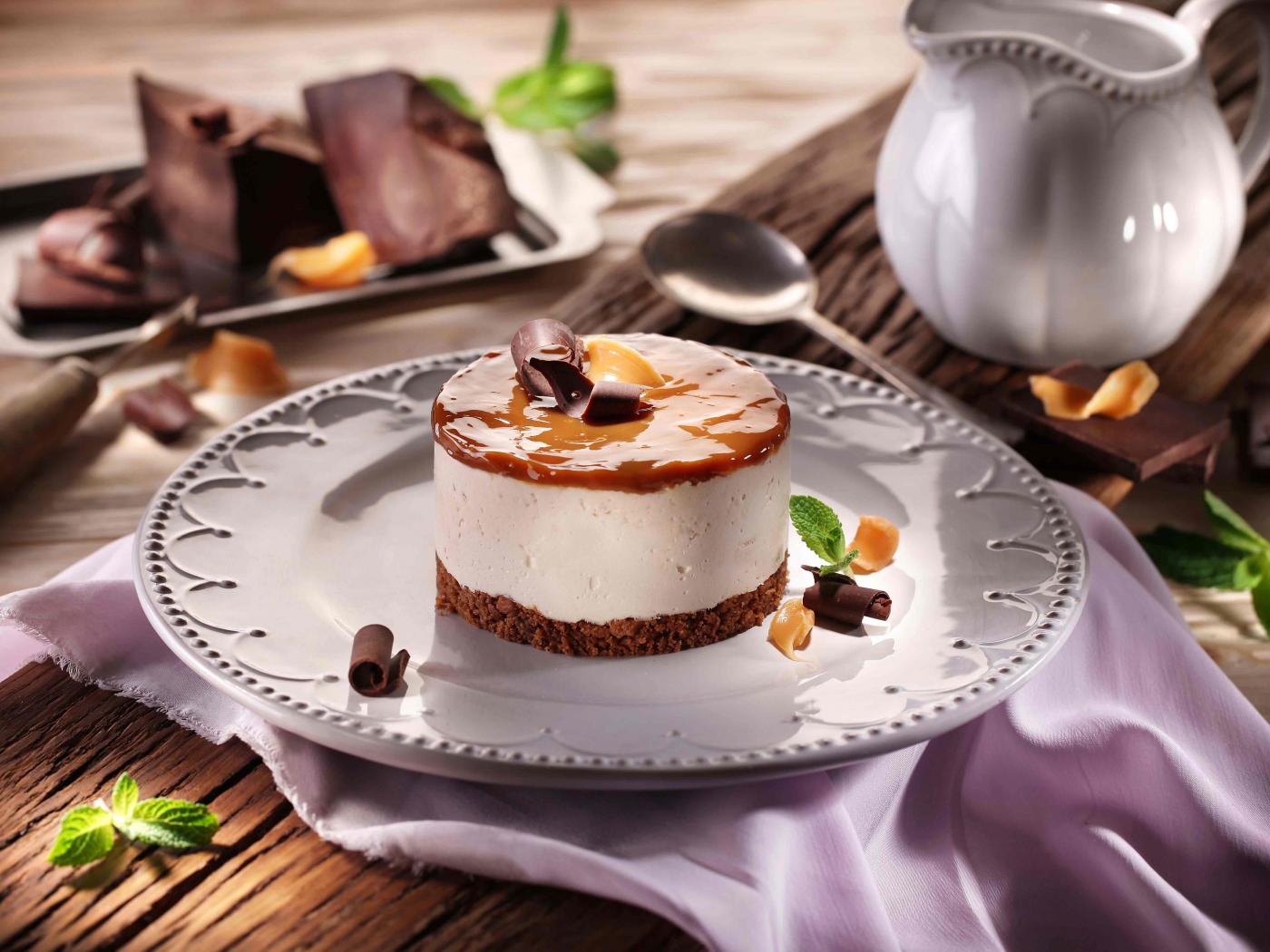Обои Пирожное на большой круглой тарелке на столе с шоколадом