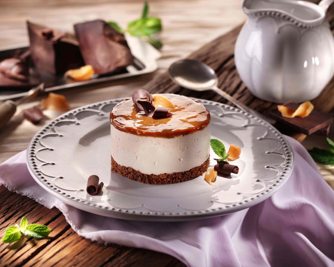 Обои Пирожное на большой круглой тарелке на столе с шоколадом