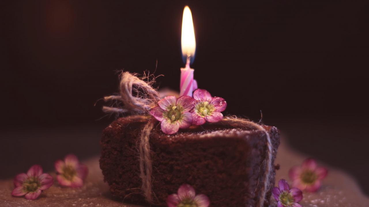 Обои Кусок торта на столе с розовыми цветами и свечкой